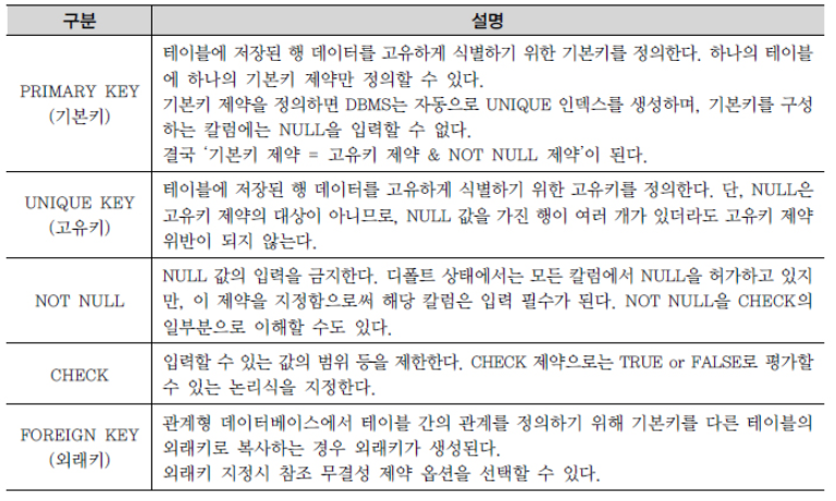 * 데이터의 무결성을 유지하기 위한 DB의 보편적인 방법으로 테이블의 특정 칼럼에 설정하는 제약.