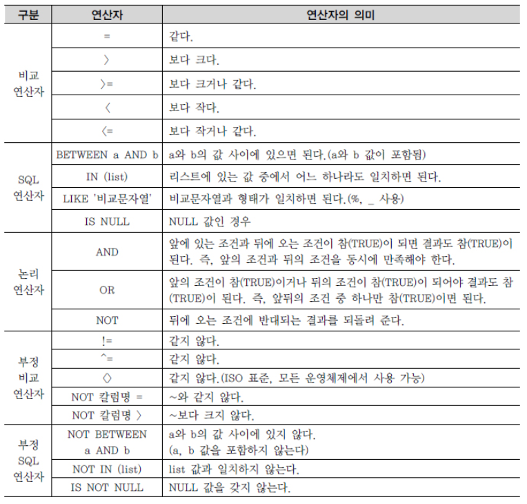 * 전체 데이터 중에서 필요한 데이터만을 검색하기 위해 WHERE 절을 사용해 데이터에 조건을 부여할 수 있다.