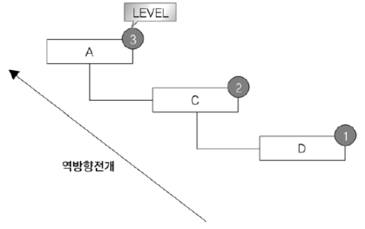 : 'PRIOR 자식 = 부모 형태' 를 사용하면 해당 노드의 자식이 어떤 노드의 부모 노드인지를 찾으므로 부모 --> 자식 방향으로 전개하는 순방향 전개.