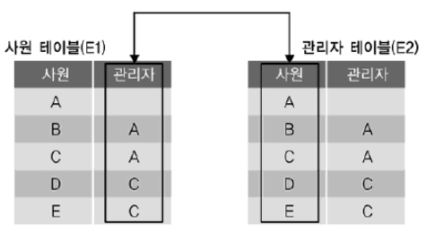 ex) 사원 테이블에서는 사원들 사이에 상위 사원(관리자)와 하위 사원 관계가 존재.