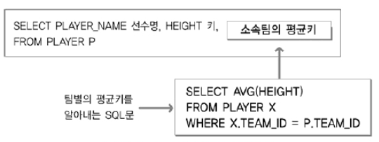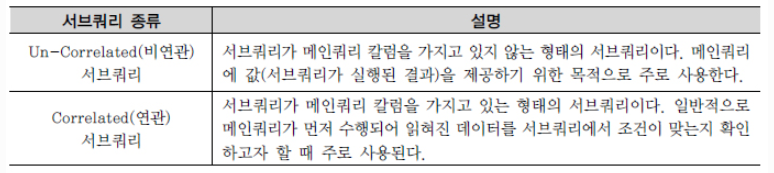 * 서브쿼리는 메인쿼리의 칼럼을 모두 사용할 수 있지만, 반대로 메인쿼리는 서브쿼리의 칼럼을 사용할 수 없다.