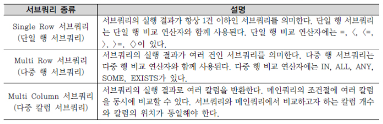 D. 서브쿼리의 종류