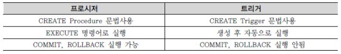 * 프로시저는 BEGIN ~ END 절 내에 COMMIT, ROLLBACK과 같은 트랜잭션 종료 명령어를 사용할 수 있지만, 트리거는 BEGIN ~ END 절 내에 사용할 수 없다. 또한 DCL 역시 사용 불가능하다.