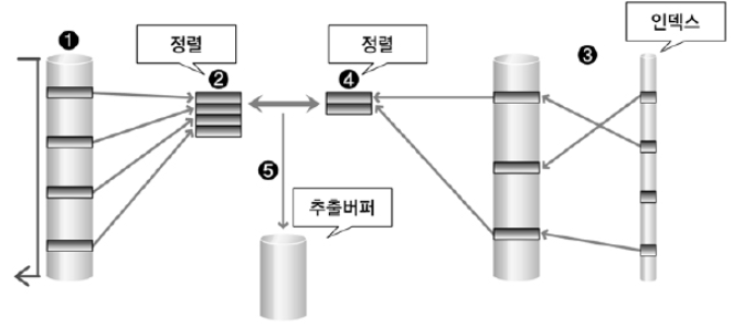 정렬된 결과를 이용하여 조인을 수행하며 조인에 성공하면 추출 버퍼에 넣음.