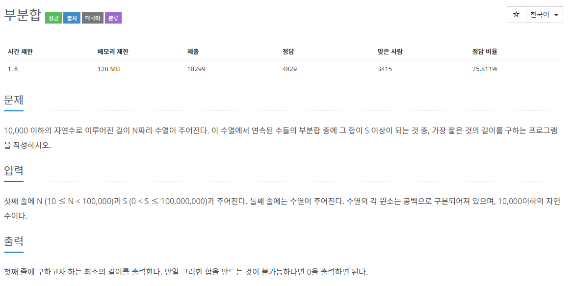 [JAVA] 백준 1806. 부분합 :: 로직/코드 - GODZ 본문